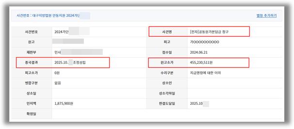 [사건의 개요]원고와 피고는 공동수급체로 이 사건 정비사업을 도급 받았고, 원고는 주관사로서 공사를 진행하되 피고는 공동수급체 비율에 따라 공동원가 분담을 하기로 약정하였습니다. 그런데 원고는 피고가 원고와의 공동원가분담의 약정에 따라 피고가 부담할 공동원가 공사비를 지급할 의무가 있으므로 원고에게 공사의 진행으로 발생한 공동원가 중 피고의 분담금 481,631,575원을 지급할 의무가 있다며, 피고를 상대로 공동분담금 청구의 소를 제기하였습니다.