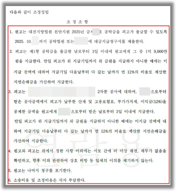 [법원의 판단]법원은, 피고는 원고에게 미지급 공사원가분담금은 1억9천만 원임을 확인하고, 이를 피고가 공탁금을 출금한 날로부터 3일 이내에 원고에게 그 중 1억 9,000만 원을 지급하기로 하는 조정이 성립되었습니다.
