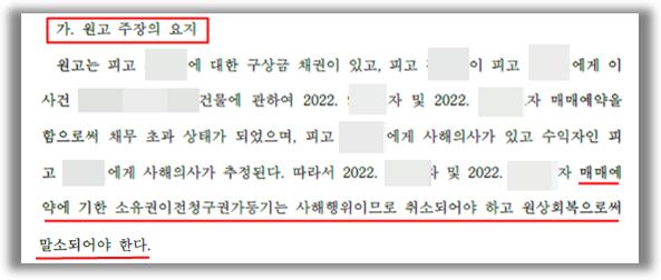 [원고 주장의 요지]원고는 채무자 피고1. ○○○에 대하여 약 5천5백만원의 구상금 채권을 가지고 있었는데, 위 채무자인 피고1. ○○○은 자신 소유의 부동산을 피고2. ■■■에게 매매하기로 하는 매매예약을 체결하였습니다. 그리고 피고2.■■■는 위 매매예약에 근거하여 피고1. ○○○ 소유의 부동산에 대하여 소유권이전청구권가등기를 경료하였습니다. 그러자 원고는 위 매매계약은 사해행위이므로 채권자 취소권에 기하여 이 사건 매매계약의 취소 및 원상회복으로 피고2. ■■■에게 이전된 소유권이전등기청구권가등기의 말소등기절차를 이행하는 한편 피고1. ○○○에게 구상금 채권 약 5천5백만 원의 지급을 구하는 이 사건 소를 제기하였습니다.