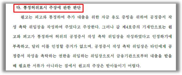 [법원의 판단]법원은, 원고와 피고가 통정하여 허위의 공정증서 작성 촉탁 위임장을 작성하였다고 인정하기에 부족하고, 달리 이를 인정할 증거가 없으며, 공정증서 작성 촉탁 위임장은 타인에게 공정증서 작성을 촉탁하는 권한을 위임하는 위임장으로서 금융기관으로부터 대출을 받을 때 필요한 서류가 아니므로 원고의 주장은 이유가 없어 기각한다는 판결을 선고 하였습니다.