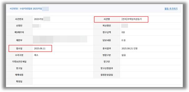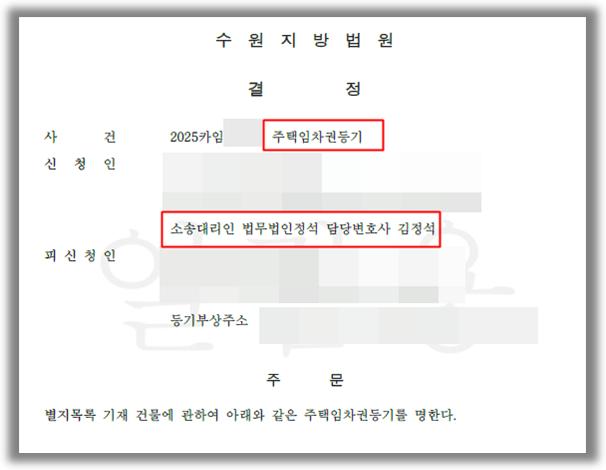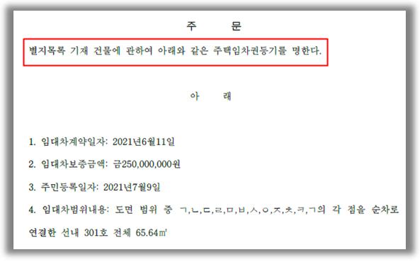 [법원의 판단]법원은, 신청인의 주택임차권등기 신청은 이유가 있다며 피신청인 소유의 건물에 관하여 아래와 같은 주택임차권등기를 명하였습니다.