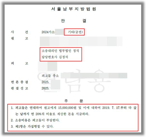 오늘은 [법무법인 정석]에서 ‘대여금반환 청구소송’을 제기하여 승소 판결을 받은 승소사례를 전해드리겠습니다.