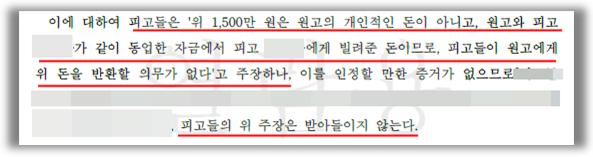 [피고 주장의 요지]당시 피고1은 위 금원은 원고와 피고1이 같이 동업한 자금에게 피고에게 빌려 준돈이므로 피고들이 원고에게 위 돈을 반환할 의무가 없다고 주장하였습니다.