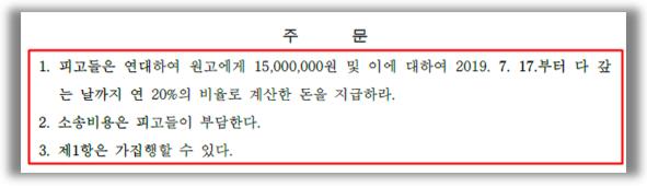 [법원의 판단]법원은, 원고가 피고2의 연대보증 아래 피고1에게 1,500만 원을 월 3%의 이율로 대여한 사실을 인정할 수 있으므로 피고들은 원고에게 15,000,000원과 이에 대한 지연손해금을 지급할 의무가 있다는 원고 승소판결을 내리고, 소송비용은 패소한 피고들이 부담하라는 판결을 선고 하였습니다.
