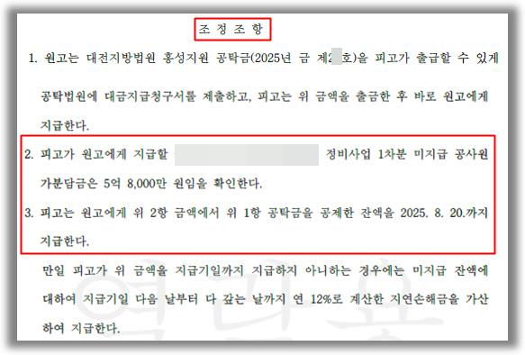 [법원의 판단]법원은, 피고는 원고에게 미지급 공사원가분담금은 5억8천만 원임을 확인하고, 이를 2005. 8. 20.까지 지급하며, 원고의 피고에 대한 나머지 청구를 포기하기로 하는 조정이 성립되었습니다.