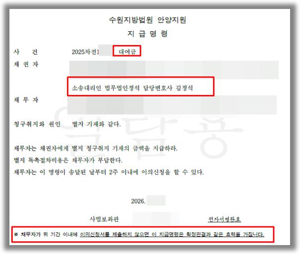 [민사] '대여금 미변제에 대한 지급명령 신청 인용 및 지연손해금 확보 승소사례'