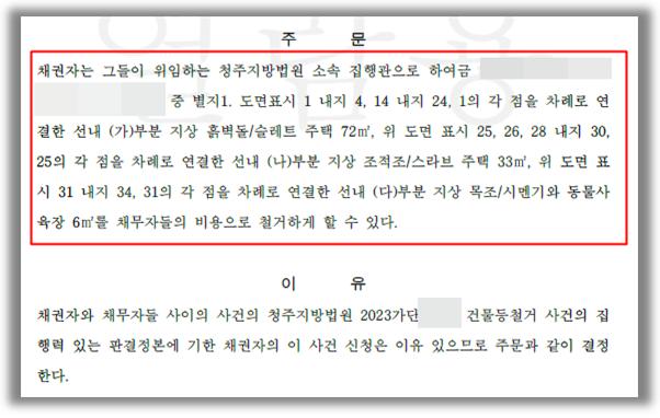 [법원의 판단]법원은, 원고의 건물등철거 대체집행신청은 이유가 있다며 법원 소속 집행관으로 하여금 불법 건축물을 채무자들인 피고들의 비용으로 철거하게 할 수 있다는 결정을 하였습니다.