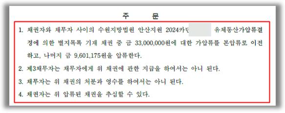 이후 채권자는 본안판결에서 승소판결을 받아 본 법무법인은 가압류에서 본압류로 이전하는 채권압류 및 추심명령을 신청하였습니다.