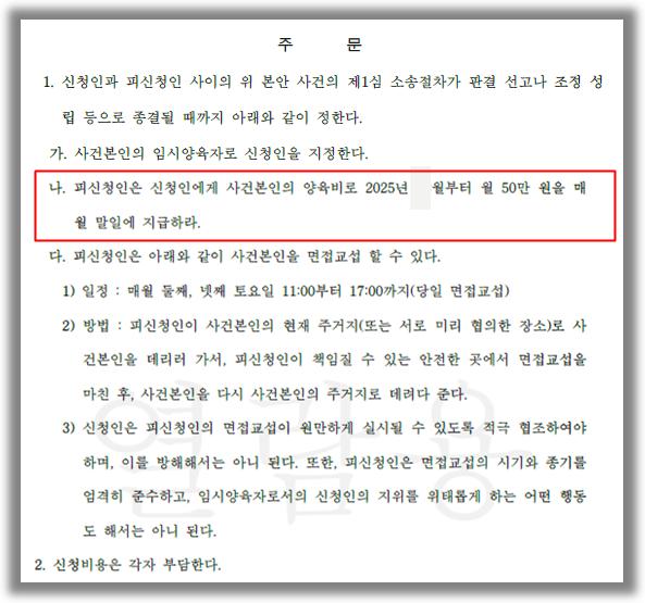 [법원의 판단]법원은 제출된 증거와 양 당사자의 주장을 종합적으로 검토한 결과, 가사소송법 제62조 제1항에 의하여 사전처분으로서 의뢰인이 상대방에게 지급하여야 할 양육비를 월 50만 원으로 결정하였습니다.