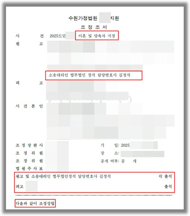 (본 승소사례는 실제 조정조서를 바탕으로 작성되었으며, 친권자 및 양육자 지정의 기준, 양육비와 재산분할 청구권의 교환적 조정, 부제소 합의의 효력 등의 법리를 이해하는 데 도움을 드리기 위한 것입니다. 개별 사건은 구체적인 사실관계에 따라 결과가 달라질 수 있으므로, 법률전문가와의 상담을 권장합니다.) |