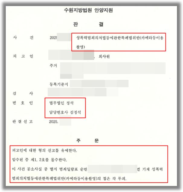 오늘은 [법무법인 정석]에서 ‘성폭력범죄의처벌등에관한특례법위반(카메라등이용촬영)’ 혐의로 기소된 피고인을 적극적으로 변호하여 ‘선고유예 및 무죄’를 받은 승소사례를 전해드리겠습니다.